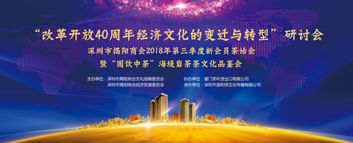 为深入学习贯彻习近平新时代中国特色社会主义思想和党的十九大精神,继承和发扬党的光荣传统,在新时代弘扬改革开放主旋律,与广大商会成员共同回顾改革开放光辉历程,展望未来经济文化转型。由深圳市揭阳商会主办,厦门茶叶进出口有限公司协办的“改革开放40周年经济文化的变迁与转型”研讨会、深圳市揭阳商会2018年第三季度新会员茶话会暨“国饮中茶”海堤岩茶茶文化品鉴会将于10月16日在深圳龙岗举行。