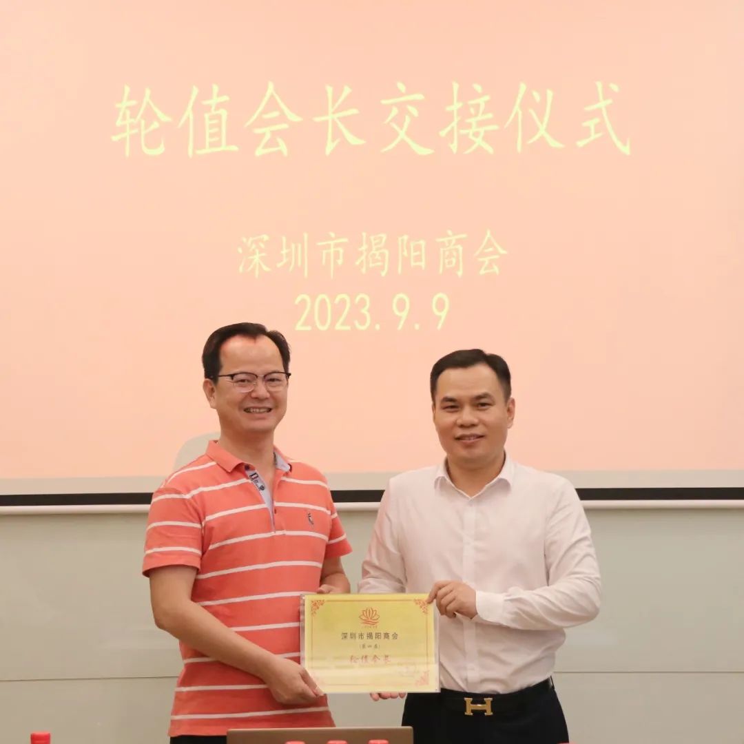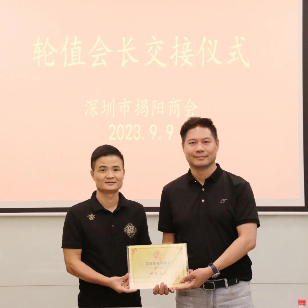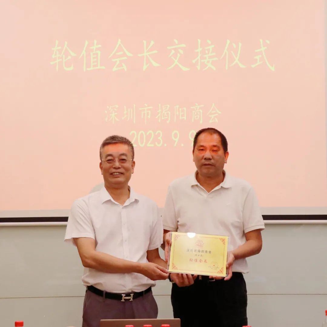 2023年9月9日下午,深圳市揭阳商会新一期轮值会长交接仪式在常务副会长孙剑波企业——深圳市国汇通投资有限公司举行。会长黄时余,监事长陈秋鹏,执行会长邱杰钦,上期轮值会长代表杨育彬、李宏生、陈明弟、孙剑波,本期轮值会长代表倪潮锋、吴海敏、陈浩鹏,常务副会长洪少坤、陈少平、徐梦虎、刘怀德、杨瑞彬、周叶信、谢晓鹏,副监事长王跃鹏,秘书长吴楚霞,副秘书长杨经纬等参加了本次轮值交接仪式。