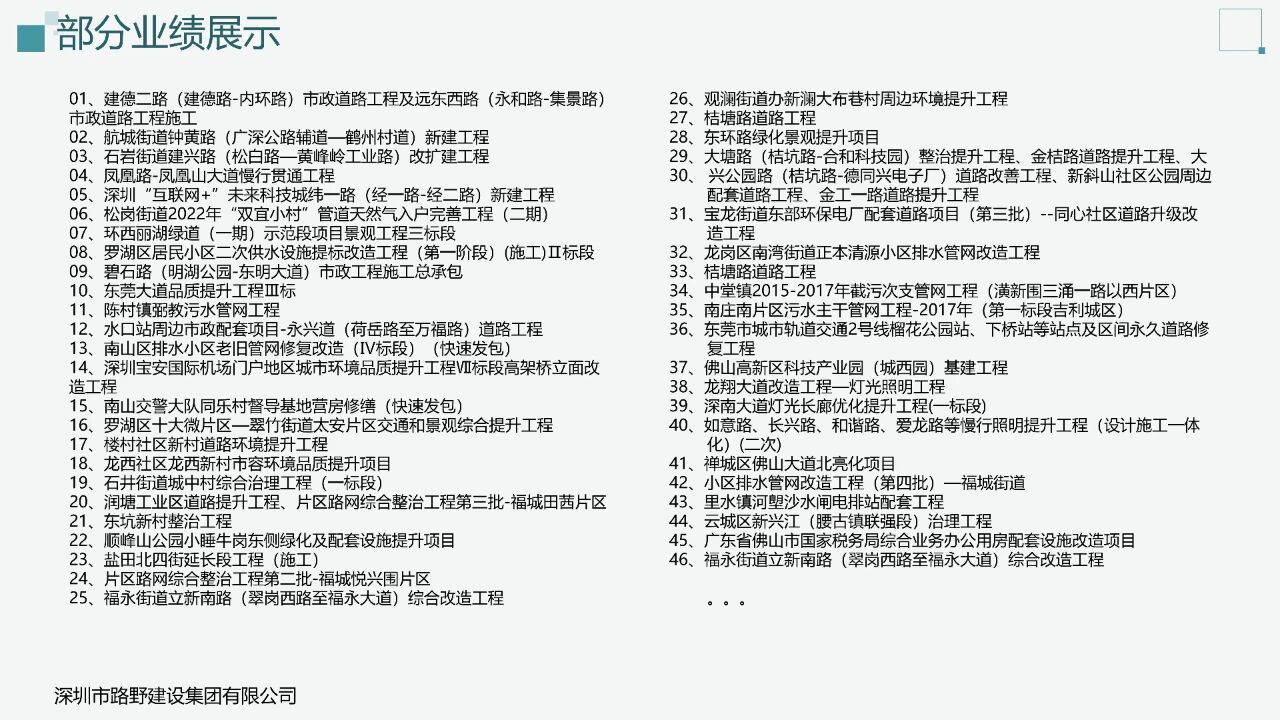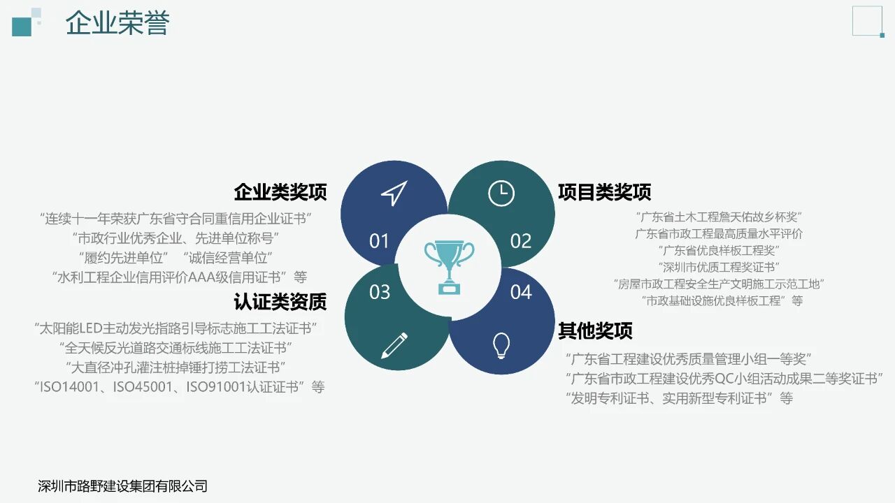 深圳市路野建设集团有限公司成立于1995年,注册资金10300万元。公司目前具备市政工程施工总承包壹级、建筑装修装饰工程专业承包壹级、建筑机电安装工程专业承包壹级、建筑工程施工总承包贰级、特种工程(限结构补强)专业承包不分等级、水利水电工程施工总承包二级、钢结构工程专业承包二级和公路交通工程(限公路机电工程分项)专业承包贰级、公路交通工程(限公路安全设施分项)专业承包贰级等资质。