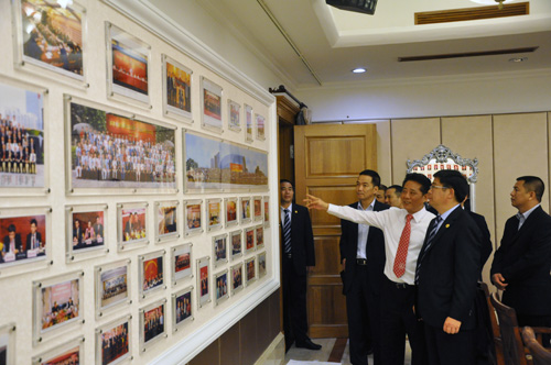 会长郑汉明及其商会领导团队首先向我会介绍了深圳市汕头商会的基本情况,并带领我会参观了办公会所。随后双方来到会议室进行座谈。郑汉明会长首先对我会到访表示欢迎。他表示,深圳市揭阳商会有非常强的领导核心,商会运营起步扎实,目前会务蓬勃发展,运营的实体也令自己非常羡慕。他阐述了自己对“商会”二字的理解,即“商”是实体,“会”是平台。只有把“商”运营好了,“会”才能持续生命力;而只有依靠“会”这个平台,“商”才能稳步运营。他表示现在是两商会会务交流、商务合作相当好的契机,希望大潮投资集团有限公司今后能与揭商集团在一些项目上形成合作共赢。