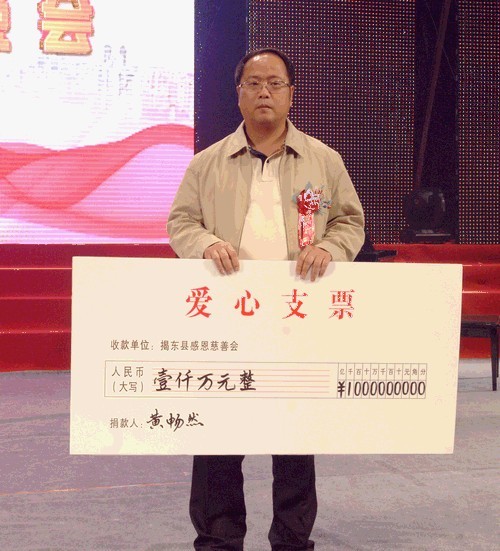黄畅然先生当选首任揭东县感恩慈善基金会会长并捐款1000万元